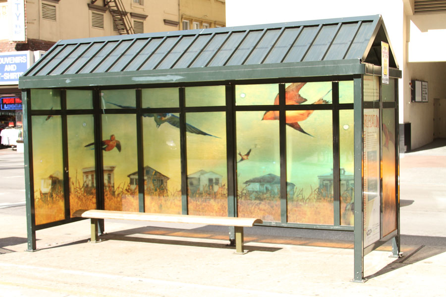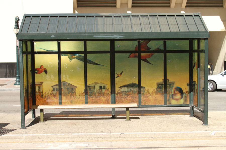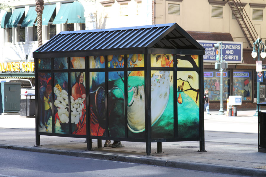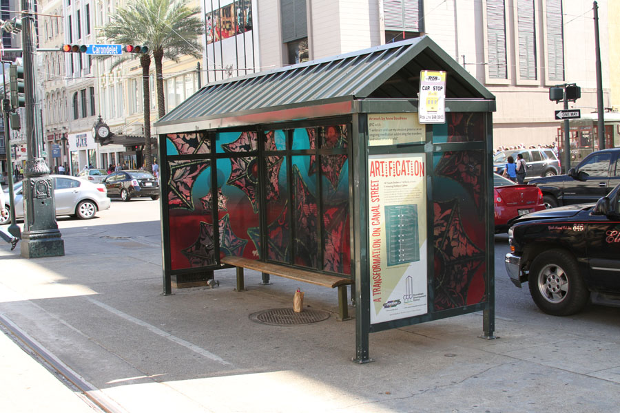 Description: DDD Artification Project. The goal of “Artification” was to dress up the Regional Transit Authority shelters with vinyl reproductions of original works by 14 Louisiana artists along Canal Street. The pieces were selected from among submissions from 127 artists eager for public-art notoriety.